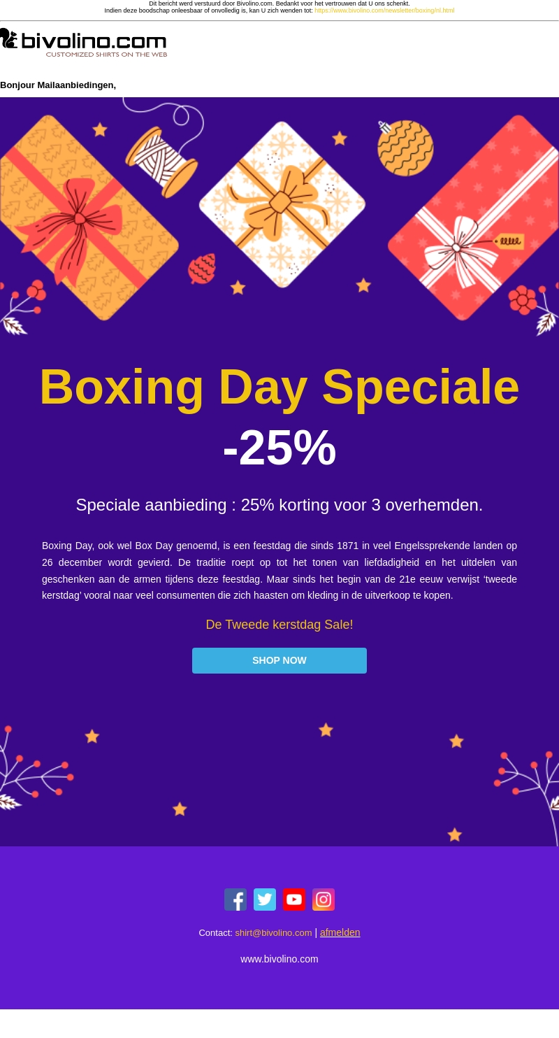 Vier Boxing Day met Bivolino's speciale aanbieding. Ontvang 25% korting op de aankoop van 3 overhemden. Een perfecte kans om uw garderobe aan te vullen met hoogwaardige kleding. Mis deze kans niet om te besparen op stijlvolle shirts. Actie geldig tot einde voorraad.