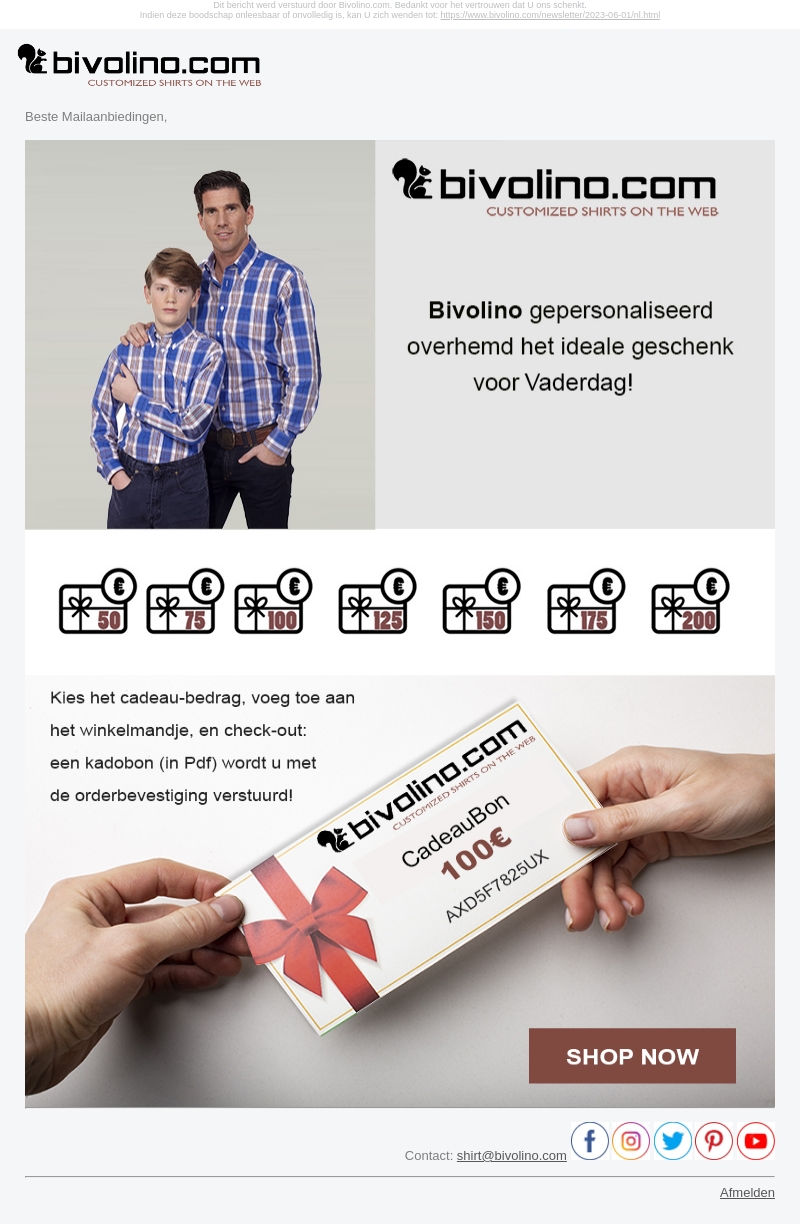 Verras jouw vader deze Vaderdag met een gepersonaliseerd overhemd van Bivolino. Kies uit verschillende cadeauverpakkingen en geef een uniek en stijlvol geschenk waar hij echt van zal houden. Bestel eenvoudig en ontvang een cadeaubon in PDF formaat bij de orderbevestiging.