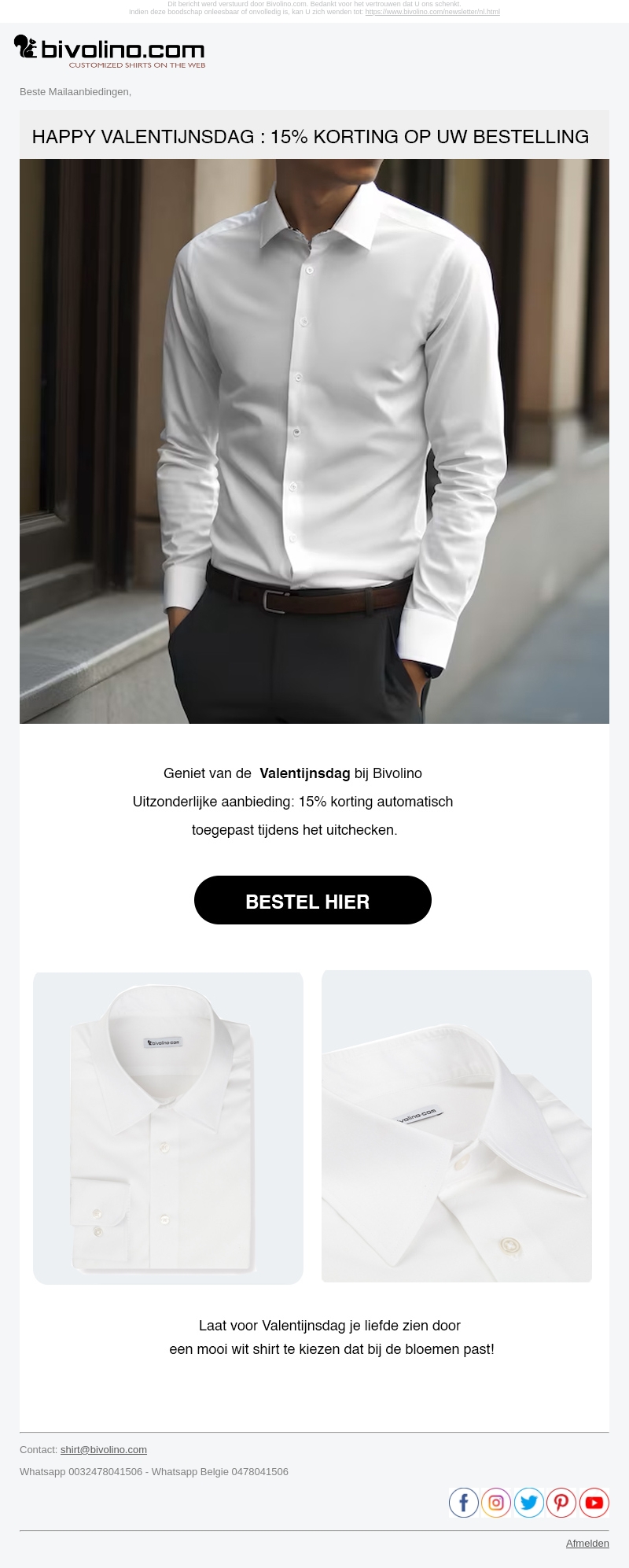 Geniet van een speciale Valentijnsdag aanbieding bij Bivolino. Ontvang 15% korting op jouw bestelling en kies een stijlvol wit shirt. De korting wordt automatisch toegepast bij het afrekenen. Laat je liefde zien met de perfecte outfit. Bestel vandaag nog en verras je geliefde!