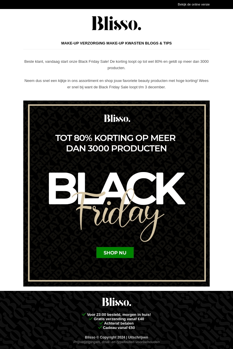 Blisso organiseert een spectaculaire Black Friday Sale met kortingen tot 80% op meer dan 3000 make-upartikelen. Profiteer van deze unieke kans om je favoriete beautyproducten voordelig te shoppen. De sale loopt tot en met 3 december, dus wees er snel bij. Bestellingen voor 23:00 worden de volgende dag al bezorgd. Gratis verzending vanaf €40 en cadeaus vanaf €50.