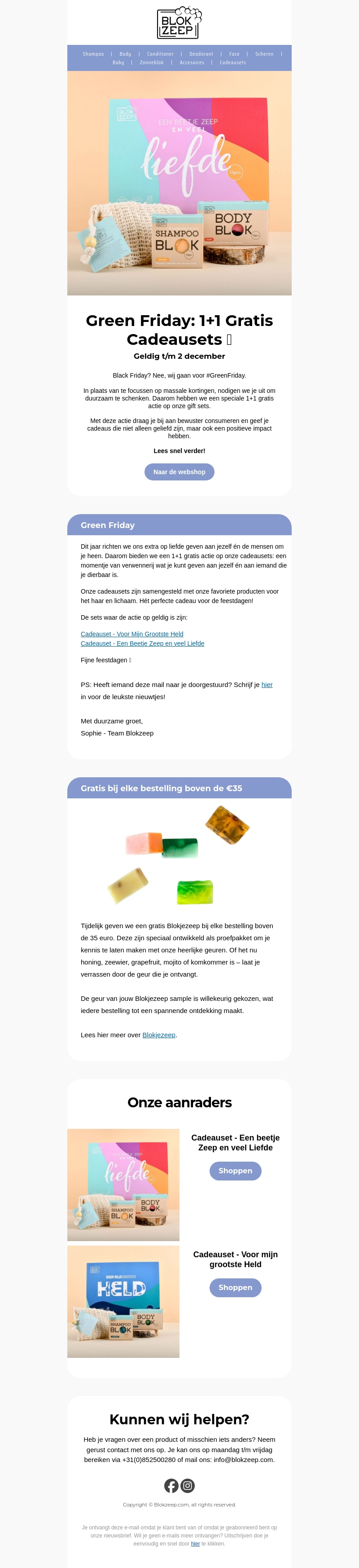 Dit jaar vieren we Green Friday met een speciale 1+1 gratis actie op cadeausets. Ontdek mooie en duurzame producten die perfect zijn om jezelf en je dierbaren te verwennen. Bij iedere bestelling boven de €35 ontvang je tevens een gratis Blokzeep sample. Geldig t/m 2 december.