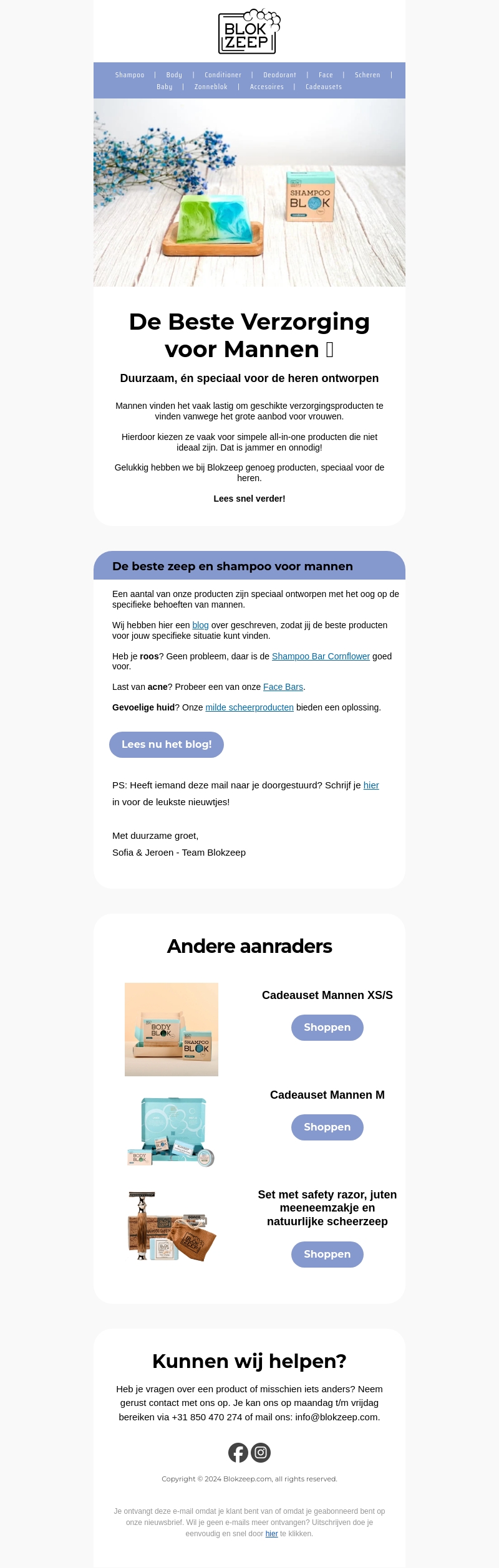 Mannen hebben vaak moeite om geschikte verzorgingsproducten te vinden tussen het overweldigende aanbod voor vrouwen. Blokzeep biedt een selectie van producten die speciaal voor de heren zijn ontworpen. Van shampoo bars tot milde scheerproducten, ontdek hoe eenvoudig en doeltreffend verzorging kan zijn.
