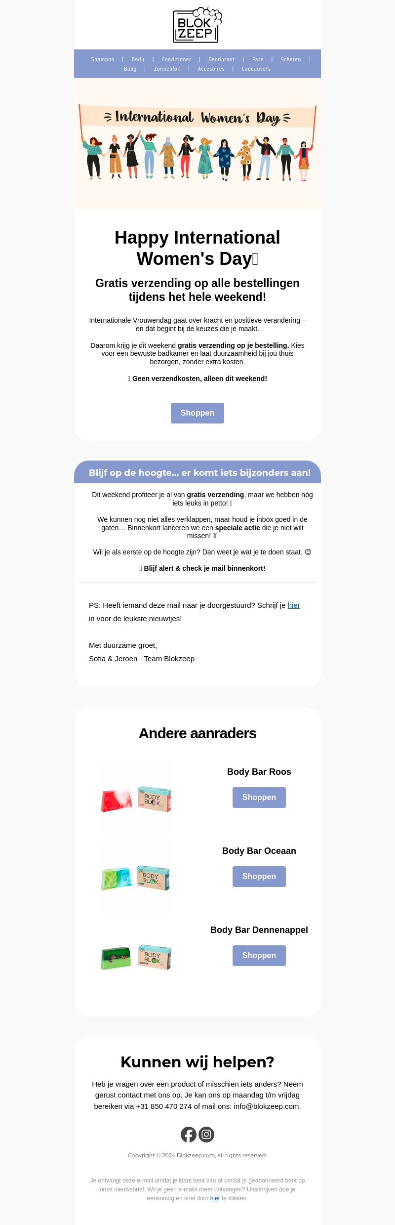 Vier Internationale Vrouwendag met Blokzeep en profiteer van gratis verzending op al je bestellingen dit weekend. Kies voor duurzame badkamerproducten en laat ze zonder extra kosten bij je thuis bezorgen. Schrijf je in voor exclusieve updates en laat je verrassen door speciale aanbiedingen. Vergeet niet onze aanbevolen Body Bars te bekijken. Doe mee en maak een positieve verandering!