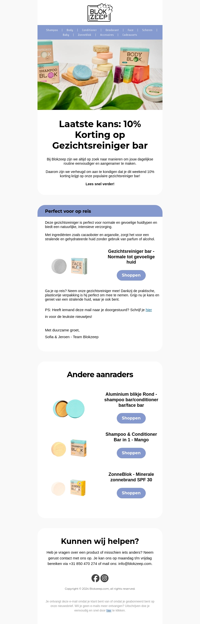 Ontvang dit weekend 10% korting op onze populaire gezichtsreiniger bar bij Blokzeep! Deze reiniger is perfect voor normale en gevoelige huidtypen en biedt natuurlijke, intensieve verzorging. Mis deze kans niet om te genieten van een stralende en gehydrateerde huid.