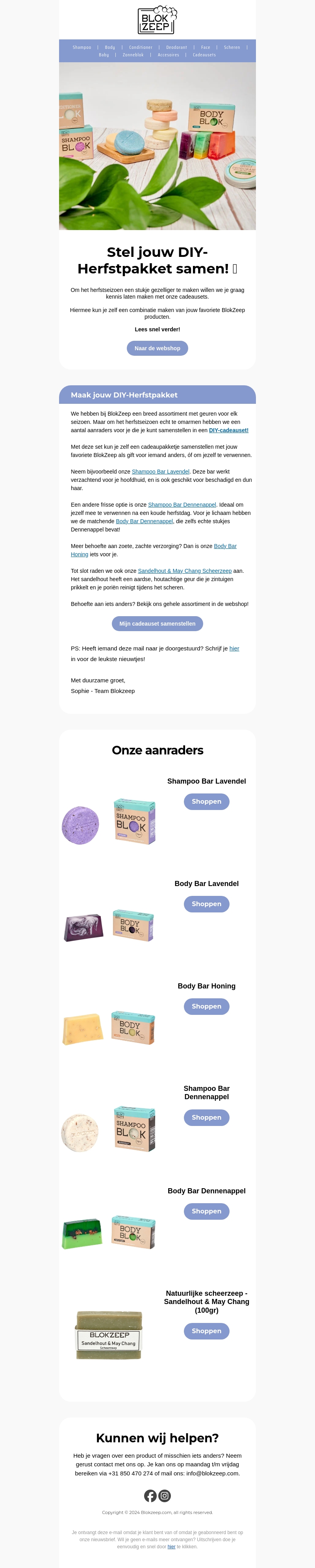 BlokZeep nodigt je uit om je eigen DIY Herfstpakket samen te stellen. Ontdek het gevarieerde assortiment met herfstgeuren en -kleuren. Kies uit populaire producten zoals Shampoo Bar Lavendel en Body Bar Honing. Maak je eigen combinatie en geniet van de herfst met BlokZeep.
