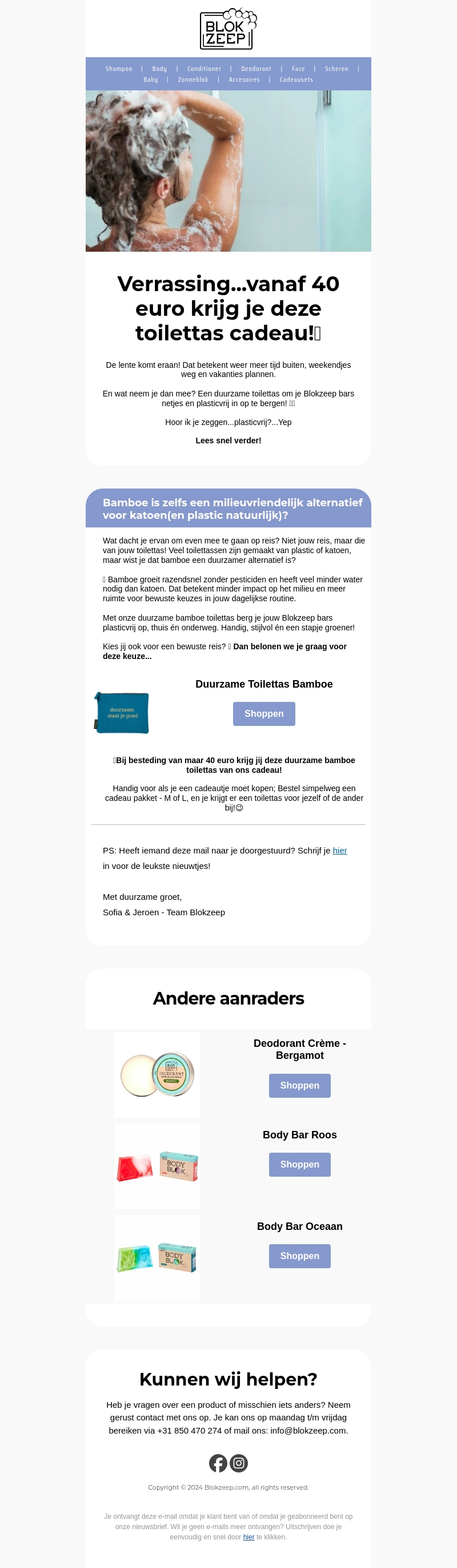 De lente komt eraan met spannende aanbiedingen van Blokzeep! Bij besteding van 40 euro ontvang je een gratis duurzame toilettas. Deze toilettassen zijn plasticvrij en gemaakt van bamboe, wat ze extra milieuvriendelijk maakt. Perfect voor je volgende reis of als cadeau. Ontdek onze collectie en stap met ons de groene toekomst in!
