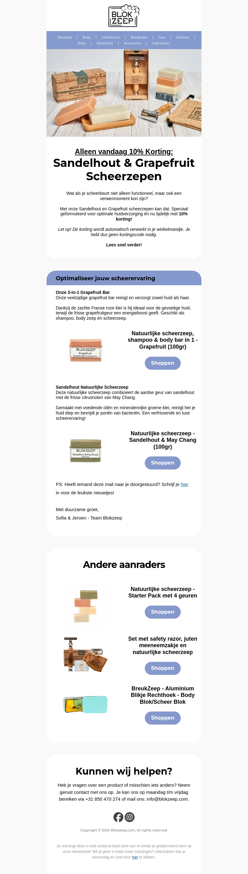 Maak van je scheerroutine een verwenmomentje met onze Sandelhout en Grapefruit scheerzeep. Geformuleerd voor optimale huidverzorging en tijdelijk met 10% korting. De veelzijdige Grapefruit bar reinigt en verzorgt zowel huid als haar, terwijl de Sandelhout zeep met frisse citrustonen een luxe ervaring biedt. Lees snel verder en ontdek meer producten!