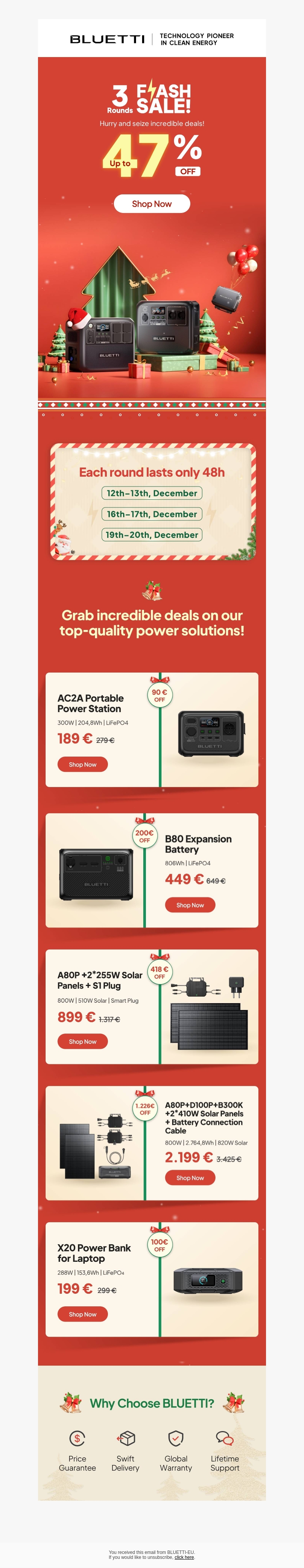 Ervaar ongekende kortingen tijdens onze 3 Ronde Flash Sale. Deze speciale aanbiedingen zijn beperkt tot 48 uur per ronde, waarin je tot 47% bespaart op topklasse stroomoplossingen. Van draagbare powerstations tot zonnepaneelsystemen, alles is afgeprijsd. Mis deze kans niet om te investeren in duurzame energieoplossingen tegen ongeëvenaard lage prijzen. Scoor nu je duurzame BLUETTI producten en bespaar groot! Bekijk alle details en voorwaarden op de website.