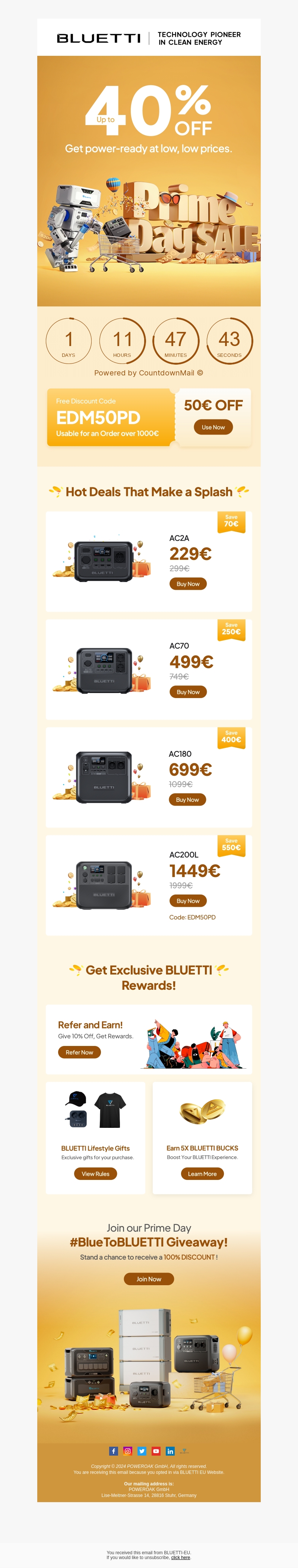 Geniet van ongelooflijke kortingen tot wel 40% tijdens de Prime Day Sale van BLUETTI. Haal uw favoriete energieproducten tegen de laagste prijzen. Mis deze kans niet! Gebruik kortingscode EDM50PD voor 50€ korting bij een bestelling van meer dan 1000€. Bekijk alle speciale aanbiedingen en exclusieve BLUETTI beloningen.