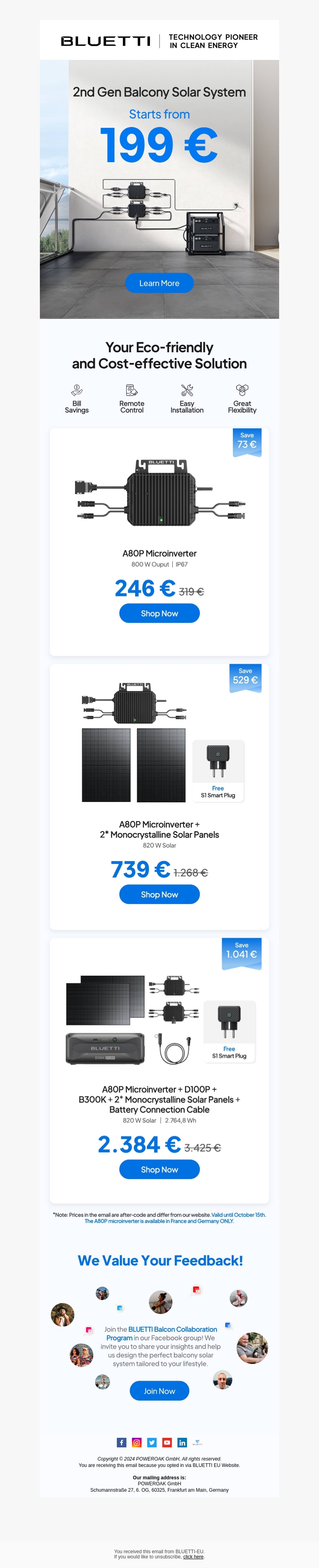 Ontmoet het 2e Gen BLUETTI Balkon Zonne-energiesysteem, nu beschikbaar vanaf 199€. Bespaar op uw energierekening en geniet van eenvoudige installatie en flexibele opties. Kies uit verschillende pakketten die aan uw behoeften voldoen.