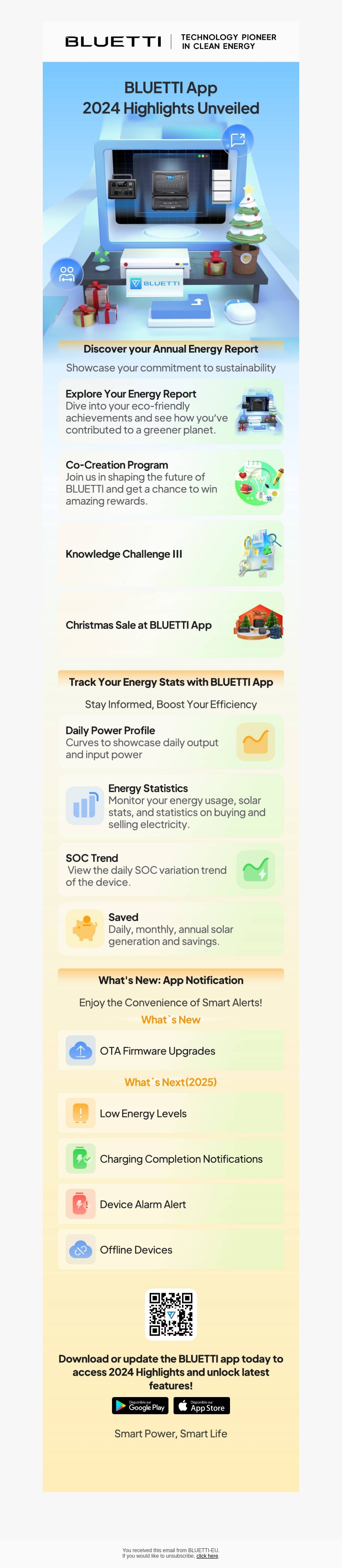 Met de nieuwe BLUETTI app kun je je energieverbruik bijhouden en bijdragen aan een groenere planeet. Ontdek je jaarlijkse energierapport, doe mee aan het Co-Creatie Programma en ontvang slimme meldingen. Mis ook de kerstuitverkoop niet voor extra kortingen.