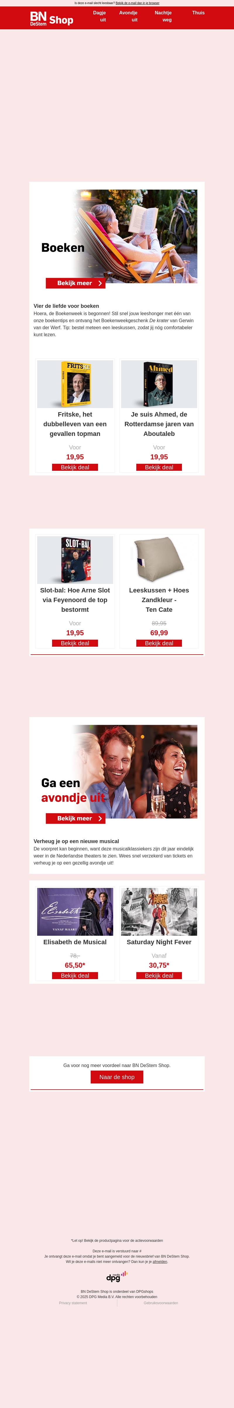 Het is Boekenweek! Ontdek onze topselectie boeken en ontvang het Boekenweekgeschenk cadeau. Van spannende biografieën tot ontspannende leeservaringen, we hebben voor elk wat wils. Profiteer ook van onze geweldige aanbiedingen op musicals voor een gezellige avond uit.