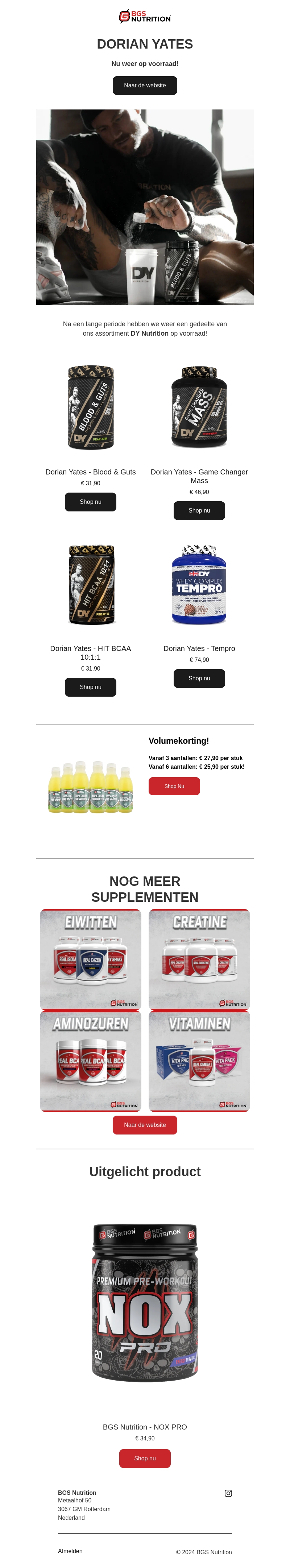 De populaire Dorian Yates Nutrition producten zijn eindelijk weer beschikbaar! Ontdek de diverse supplementen zoals Blood & Guts, Game Changer Mass, en meer. Mis de kans niet om uw voorraad aan te vullen en uw fitnessdoelen te bereiken.