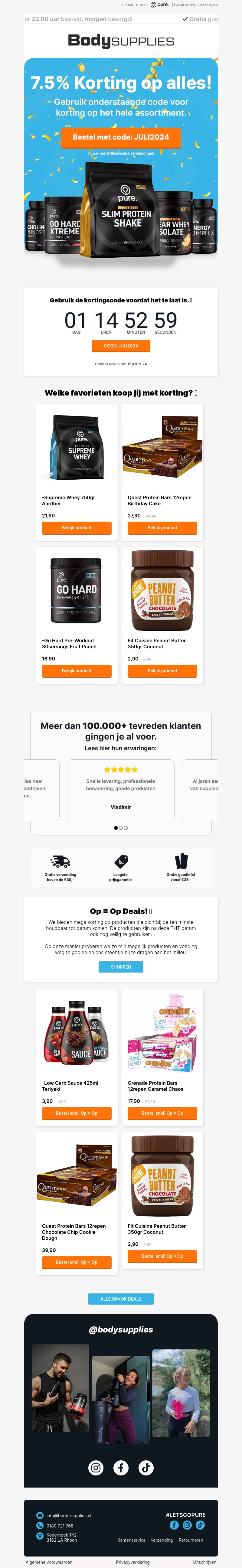 Shoppen bij BodySupplies is nu nog aantrekkelijker met 7.5% korting op alle producten. Gebruik de kortingscode JULI2024 en bespaar op je aankopen. Mis deze kans niet en bekijk onze bestsellers zoals Supreme Whey, Quest Protein Bars, en meer!
