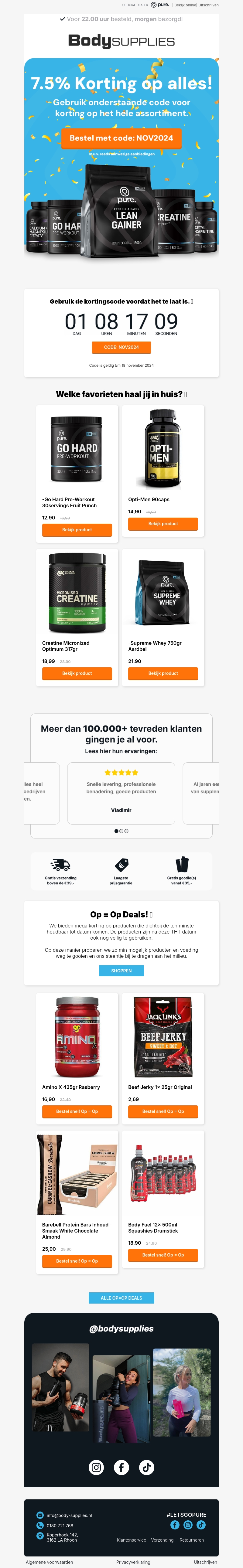 Profiteer van 7,5% korting op het gehele assortiment bij Bodysupplies. Of je nu op zoek bent naar pre-workout supplementen, creatine, of eiwitrijke snacks, het is allemaal te krijgen met korting. Haal je favorieten nu in huis en ervaar de kwaliteit die anderen roemen. Gebruik de kortingscode NOV2024 voor deze speciale aanbieding. Let op: Deze actie is tijdelijk, dus wees er snel bij!