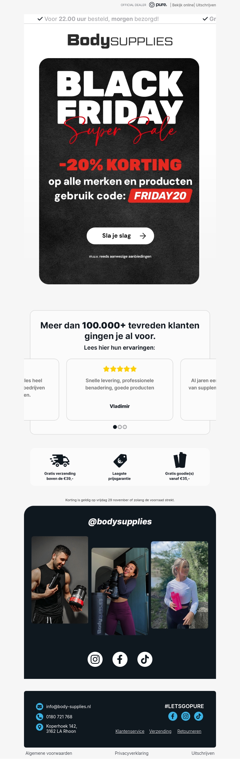 Ontdek nu de ongelooflijke Black Friday Super Sale van BodySupplies! Profiteer van 20% korting op een breed scala aan merken en producten. Gebruik de unieke kortingscode FRIDAY20 en shop naar hartelust. Onze klanten zijn al enthousiast, met meer dan 100.000 tevreden kopers die je voorgingen. Geniet ook van gratis verzending boven de €39 en gratis goodies vanaf €35. Mis deze kans niet en haal vandaag nog je favoriete producten in huis!