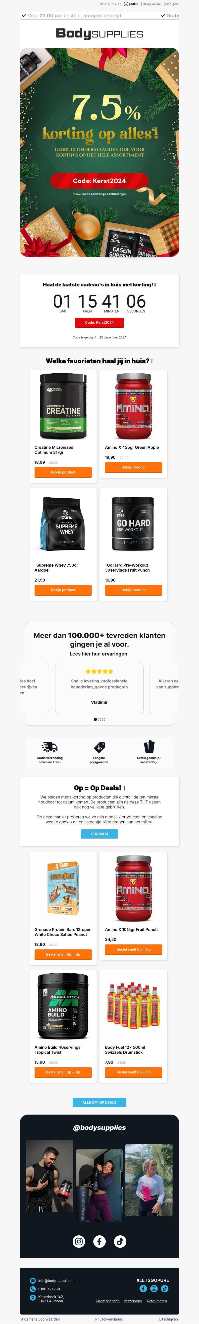 BodySupplies biedt een speciale kerstkorting van 7.5% op het hele assortiment! Gebruik de code Kerst2024 om te besparen op al je favoriete supplementen. Haal je favoriete producten in huis en profiteer van de snelle levering en uitstekende service. Beperkt geldig, dus sla je slag nu!