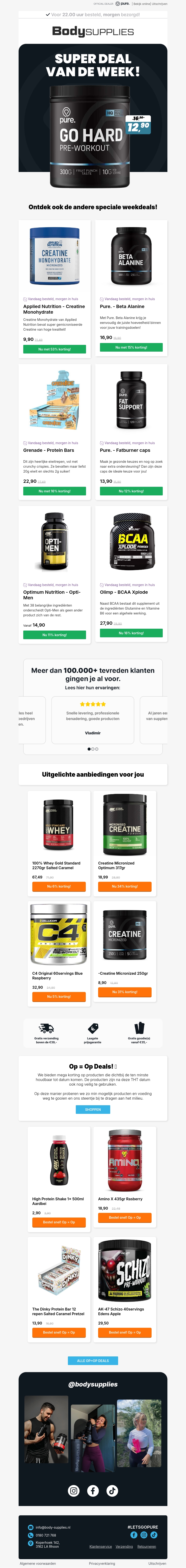 Versterk je fitnessroutine met onze Super Deal van de Week: GO HARD Pre-Workout. Profiteer van extra kortingen op creatine, eiwitten en meer. Beperkte voorraad, dus mis het niet! Bekijk nu welke producten jouw training kunnen verbeteren en bespaar groot op topmerken. Deze aanbiedingen zijn alleen geldig zolang de voorraad strekt.