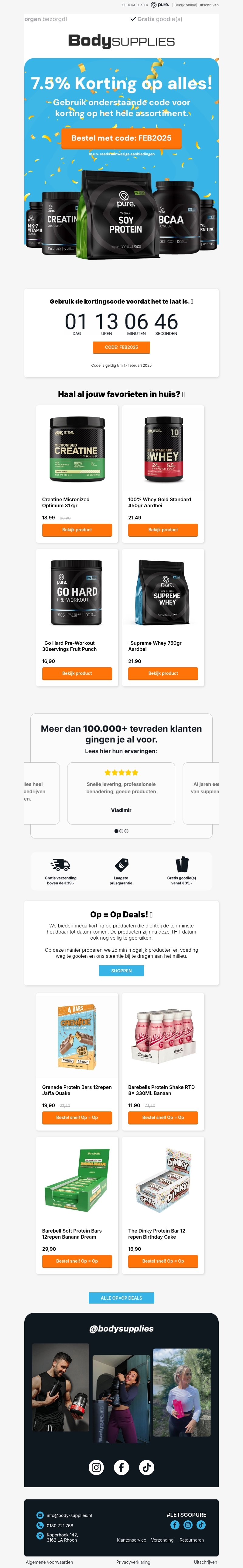 Ontvang 7,5% korting op alles bij BodySupplies met de kortingscode FEB2025. Shop nu jou favoriete producten zoals proteรฏne en supplementen. Haal snel je voordeel, want de aanbieding is tijdelijk! Ontdek waarom meer dan 100.000 klanten vertrouwen op BodySupplies.