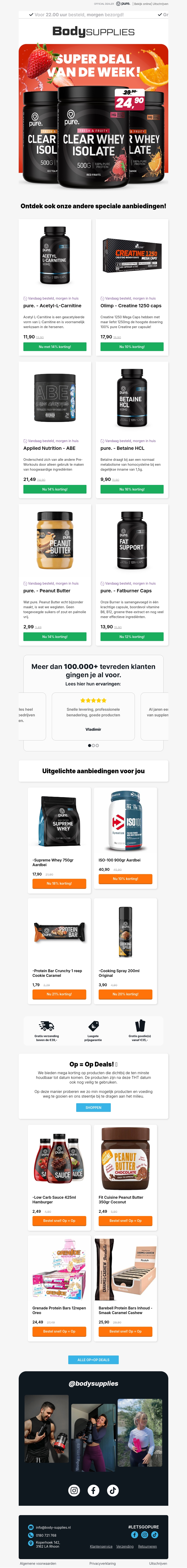 Ontdek de nieuwste aanbiedingen op BodySupplements! Deze week hebben we een super deal op Pure Whey Isolate voor slechts €24,90. Bekijk ook onze speciale aanbiedingen en profiteer van kortingen op verschillende producten. Mis het niet!