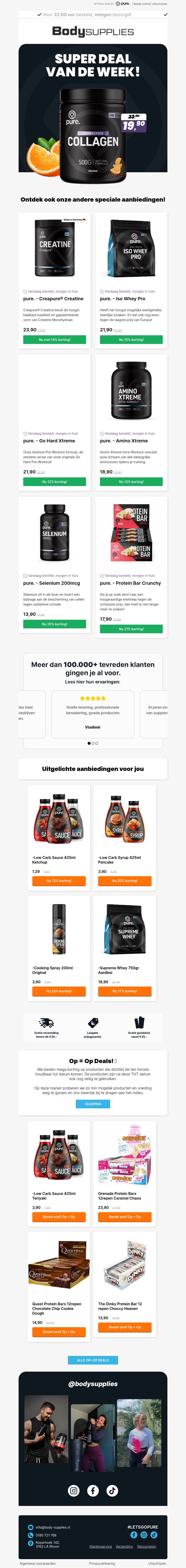 Profiteer deze week van geweldige kortingen bij BodySupplies! We bieden onder andere Pure Collagen voor een gereduceerde prijs, samen met Creatine, Whey Pro en veel meer. Ontdek ook onze speciale aanbiedingen op diverse producten zoals Go-Hard Xtreme, Amixo Xtreme, en Selenium. Meer dan 100.000 tevreden klanten gingen je voor! Mis het niet!