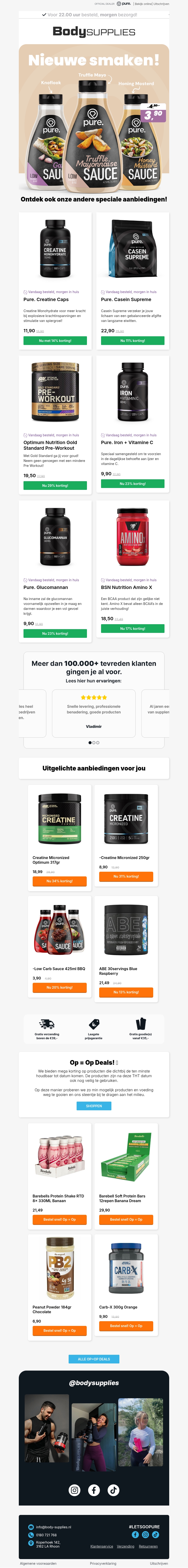 Deze week presenteert BodySupplies de nieuwste sausvarianten: Knoflook, Truffel Mayo, en Honing Mosterd. Maak kennis met speciale aanbiedingen op producten zoals Creatine Monohydraat, Optimum Nutrition Pre-Workout, en meer. Ontdek ook de verhalen van tevreden klanten en de voordelen van onze exclusieve kortingen. Blijf in topvorm met onze zorgvuldig geselecteerde supplementen en sportsupplementen.