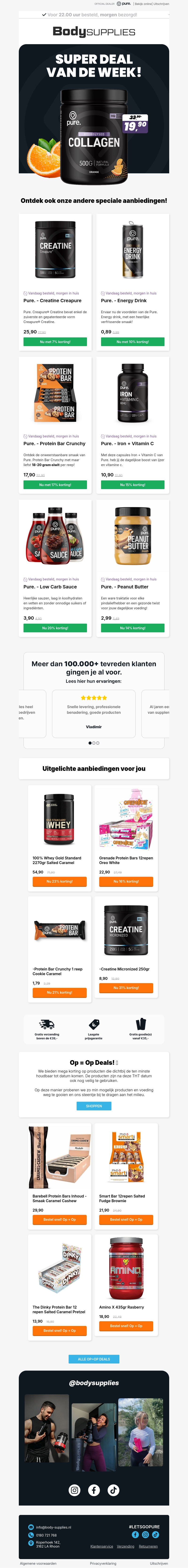 Deze week biedt BodySupplies fantastische deals op supplementen zoals Collagen, Creatine en meer. Profiteer van aanzienlijk gereduceerde prijzen op een breed scala aan producten. Ideaal voor sporters en gezondheidsbewuste consumenten. Mis deze kans niet om te besparen op hoogwaardige supplementen en voeding. Bezoek onze site voor de volledige selectie. Ontdek het assortiment en bestel voordelig!