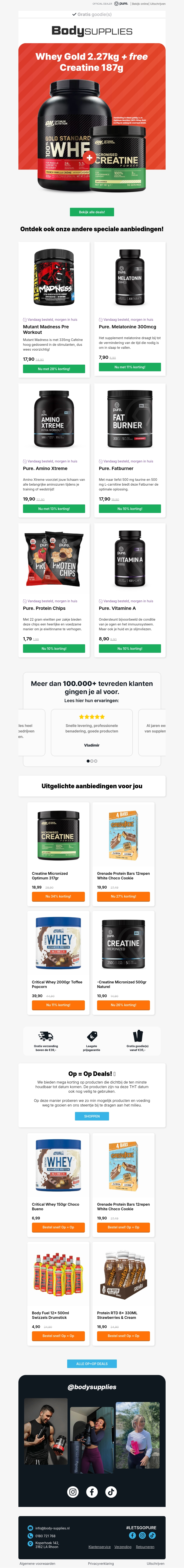 Ontdek de nieuwste deals op sportvoeding bij BodySUPPLIES. Profiteer van unieke aanbiedingen zoals Whey Gold met gratis creatine en meer. Met producten die aansluiten op jouw fitnessdoelen, is er voor ieder wat wils. Sla nu je slag en verbeter je prestaties met topkwaliteit voedingssupplementen. Laat je inspireren door de tevreden verhalen van meer dan 100.000 klanten. Mis deze kans niet!