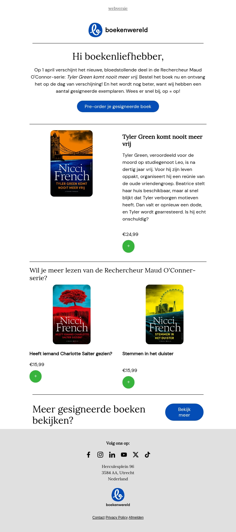 Op 1 april verschijnt het nieuwe thrillerboek van Nicci French: "Tyler Green komt nooit meer vrij". Ontvang een gesigneerd exemplaar door nu te pre-orderen. Beleef spanning en mysterie met rechercheur Maud O'Connor. Wees er snel bij, want op is op!