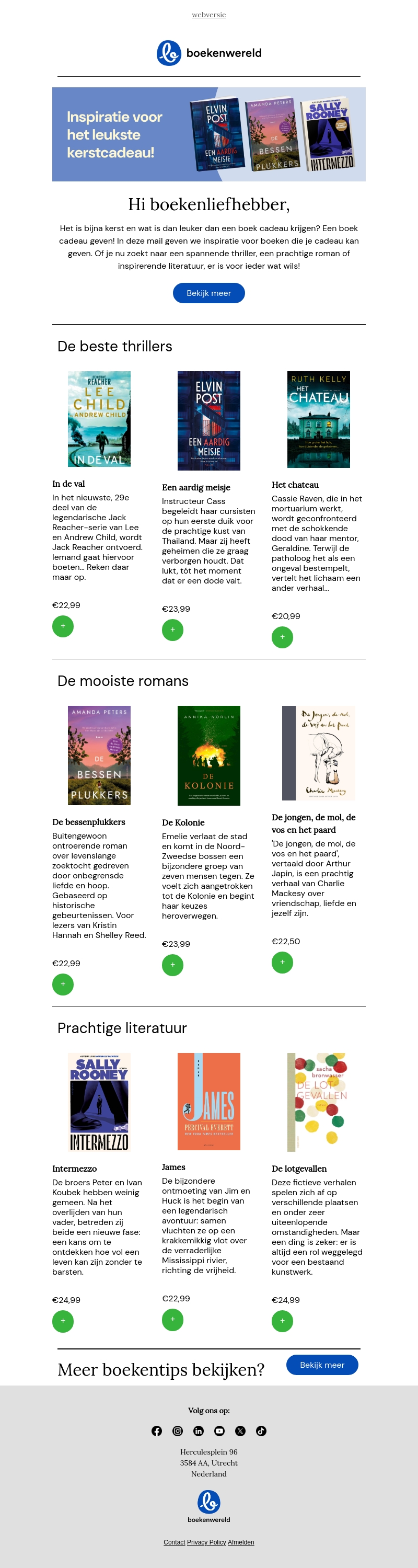 Het is bijna kerst en wat is er leuker dan een boek cadeau te krijgen of geven? In deze nieuwsbrief presenteren we een selectie van spannende thrillers, prachtige romans en inspirerende literatuur. Van Lee Child's nieuwste tot de ontroerende romans van Amanda Peters, er is voor ieder wat wils. Bekijk onze aanbevelingen en vind het perfecte boek om te geven deze feestdagen!