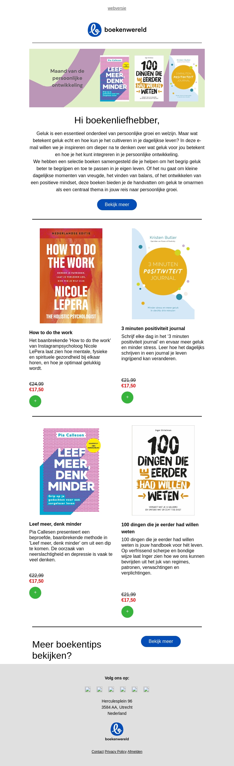 Geluk is essentieel voor persoonlijke groei en welzijn. In deze nieuwsbrief lees je hoe je geluk kunt cultiveren en integreren in je dagelijkse leven. Ontdek een selectie boeken die je helpen bij het begrijpen en toepassen van geluk. Van het vinden van balans tot het ontwikkelen van een positieve mindset, deze boeken bieden je waardevolle inzichten en praktische tips.