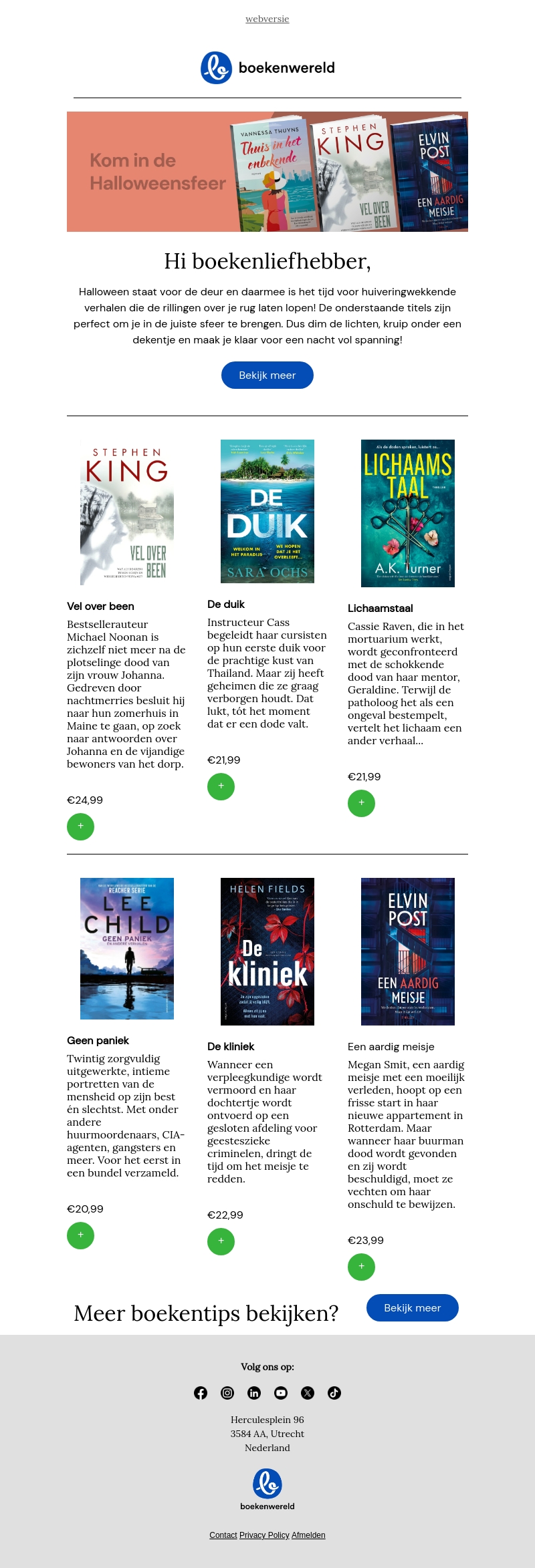 Halloween is in aantocht, en dat betekent dat het tijd is voor spannende verhalen die je de stuipen op het lijf jagen. In deze nieuwsbrief vind je een selectie van heerlijke griezelboeken die perfect zijn voor een angstaanjagende avond. Duik in de wereld van Stephen King of ontdek nieuwe thrillers waarvan je op het puntje van je stoel zit. Dim de lichten, pak een deken, en bereid je voor op een nacht vol spanning en sensatie.