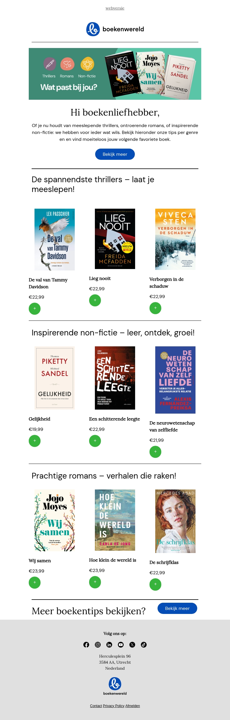Welkom bij Boekenwereld, waar we je meenemen op een literaire ontdekkingsreis. Of je nu houdt van zenuwslopende thrillers, ontroerende romans of leerzame non-fictie, wij hebben het allemaal. Laat je inspireren door onze zorgvuldig geselecteerde boekentips en vind je volgende favoriete boek. Bekijk onze collectie en duik in een verhaal dat je raakt. Mis deze literaire ervaring niet!