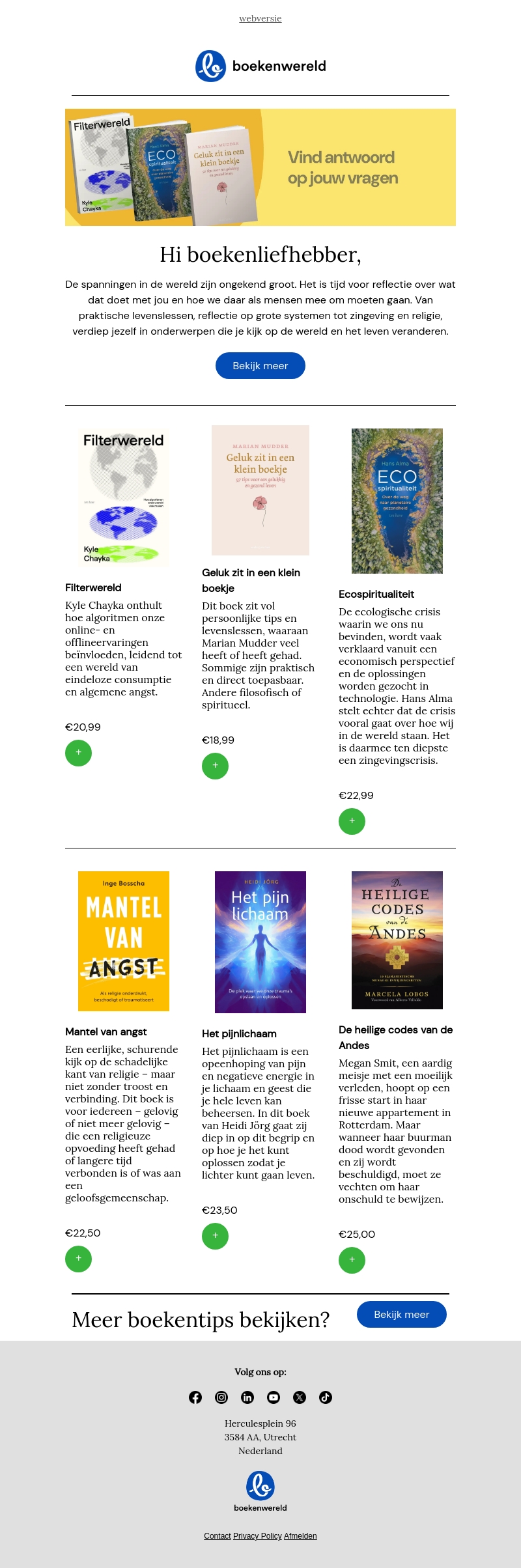 Deze nieuwsbrief van Boekenwereld helpt je bij het vinden van antwoorden op jouw vragen met een selectie van inspirerende boeken. Van de invloed van algoritmen op ons dagelijks leven tot boeken over geluk en spiritualiteit. Ontdek praktische en filosofische levenslessen die je perspectief kunnen veranderen. Elk boek biedt unieke inzichten en is een waardevolle aanvulling voor je bibliotheek.