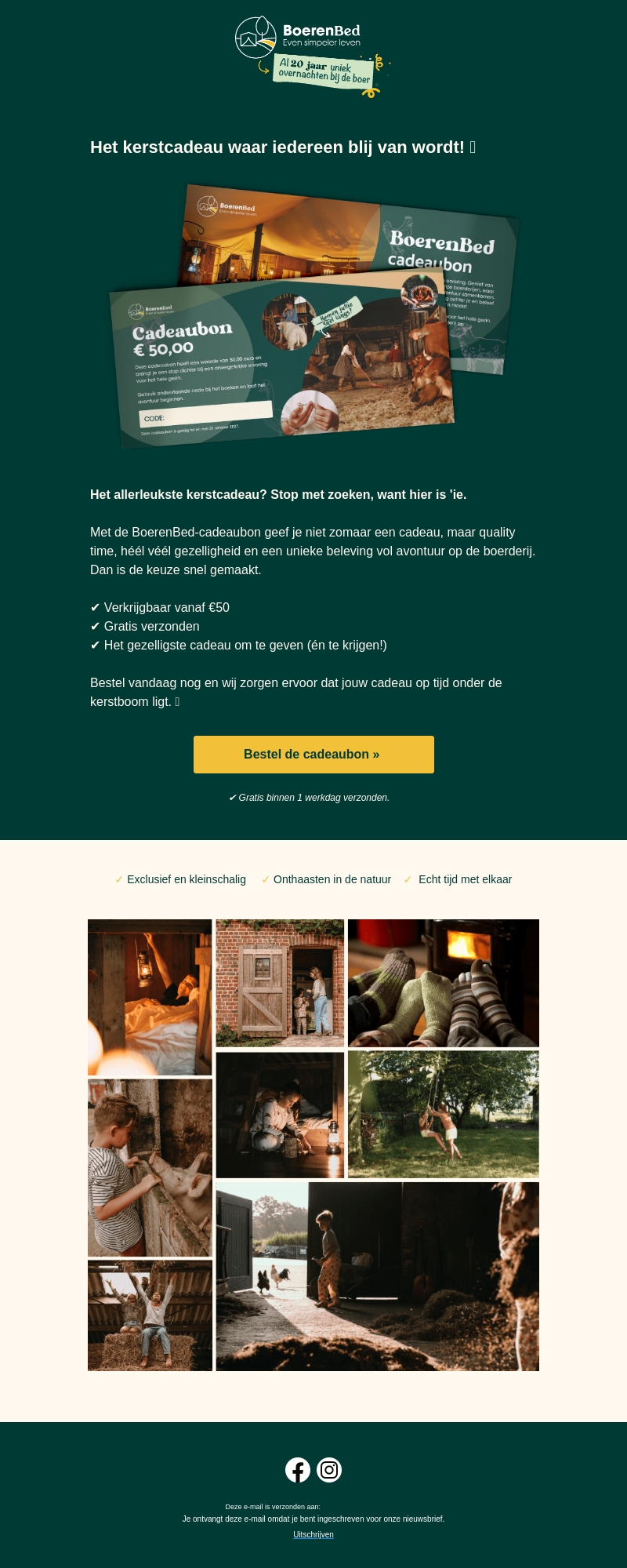 Geef dit jaar een uniek en onvergetelijk cadeau met de BoerenBed-cadeaubon. Verwen je dierbaren met quality time en een bijzondere ervaring op de boerderij. Verkrijgbaar vanaf €50 en gratis verzonden, het is het gezelligste cadeau om te geven én te krijgen. Bestel vandaag en zorg dat jouw cadeau op tijd onder de kerstboom ligt.
