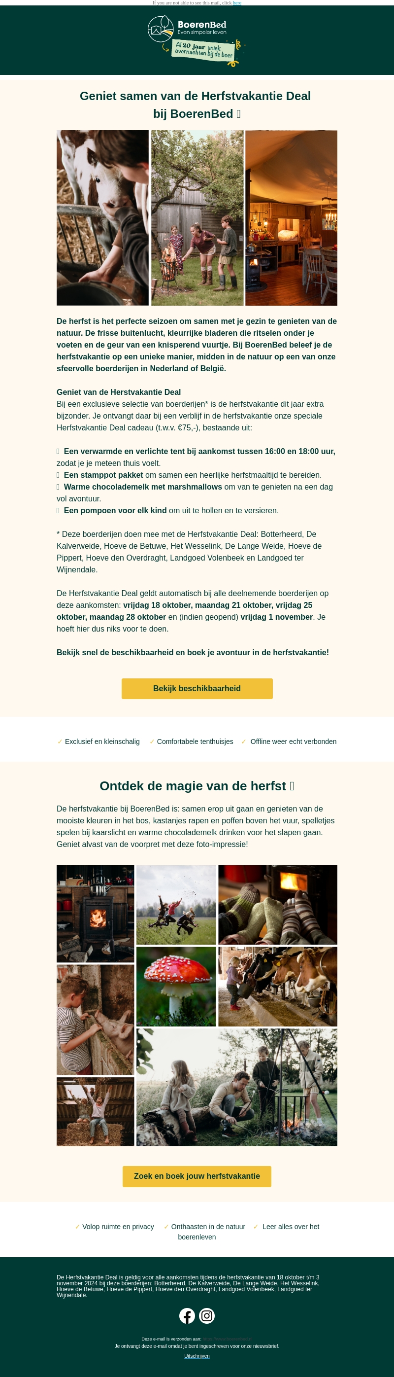 De herfst is het perfecte seizoen om samen met je gezin te genieten van de natuur. BoerenBed biedt een unieke herfstvakantie aan op een van onze sfeervolle boerderijen in Nederland of België. Geniet van een verwarmd verblijf, stamppot, warme chocolademelk met marshmallows en een pompoen voor elk kind om uit te hollen.