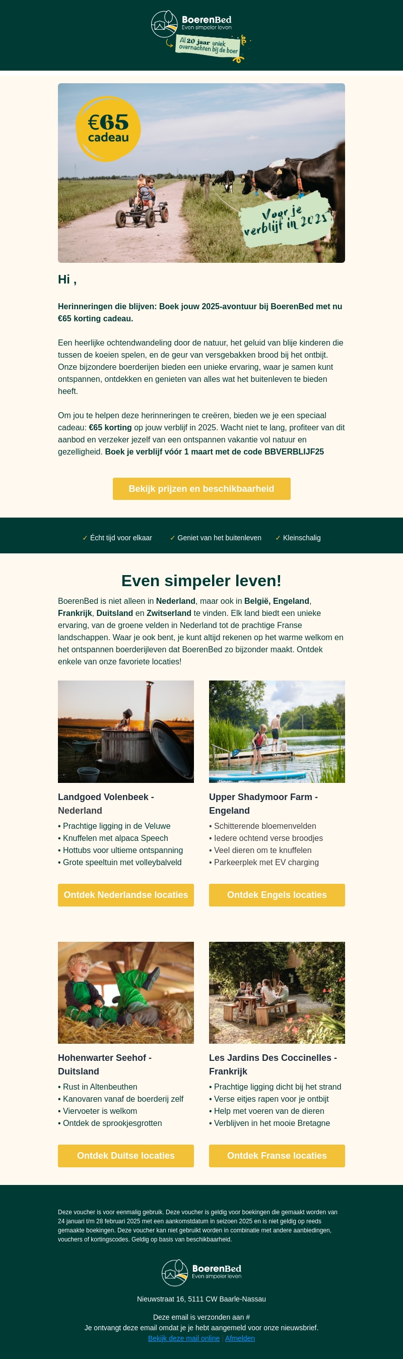 Ervaar de magie van BoerenBed met een unieke vakantie omringd door de natuur. Geniet van de rust, speel tussen de koeien en beleef alles wat het buitenleven biedt. Boek nu jouw verblijf voor 2025 en ontvang een €65 cadeaukorting. Haast je en verzeker jezelf van een ontspannen vakantie. Gebruik de speciale code voor je reservering.