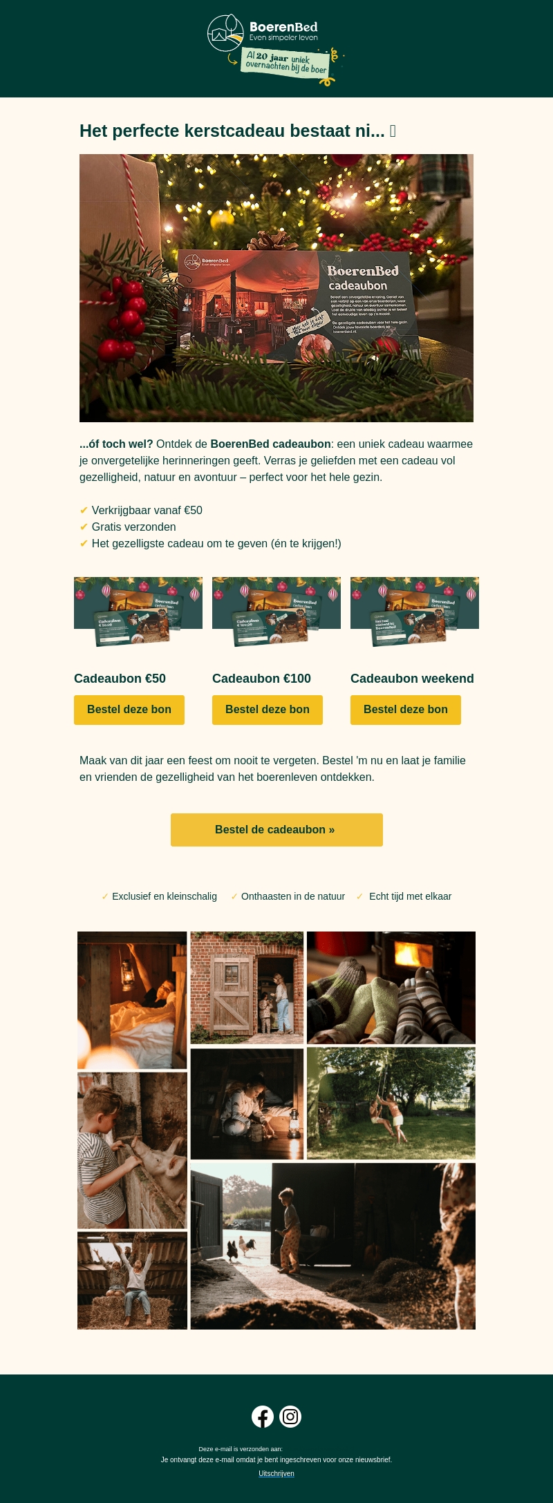 Vind het perfecte kerstcadeau met BoerenBed. Verwen je geliefden met een cadeau dat vol gezelligheid, natuur en avontuur zit. Beschikbaar vanaf €50 met gratis verzending. Ideaal voor het hele gezin en maakt elk moment bijzonder. Bestel nu je BoerenBed cadeaukaart.
