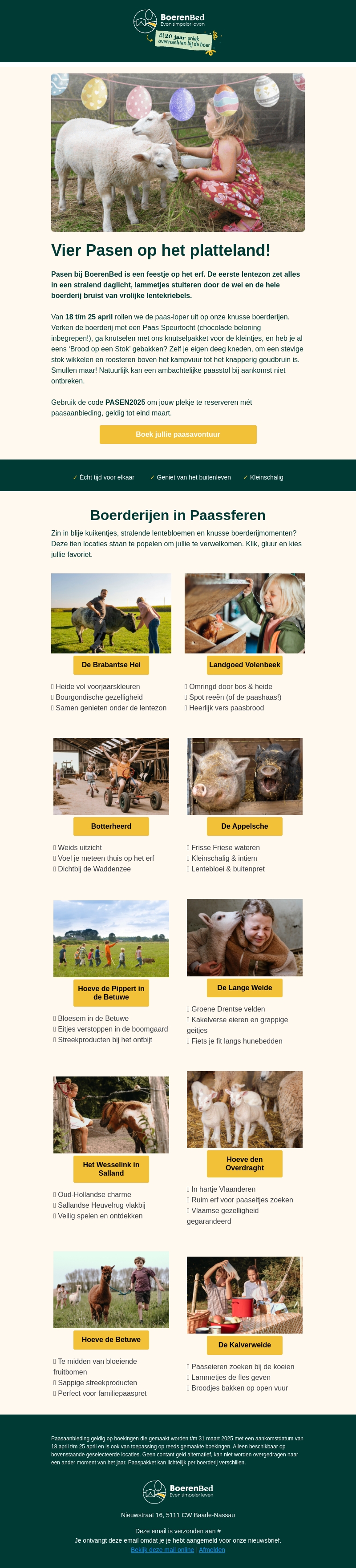 Beleef een onvergetelijk paasweekend bij BoerenBed met een speciale paasaanbieding. Geniet van lammetjes, kleurrijke lentebloemen en smakelijke paasbroodjes. Gebruik de kortingscode PASEN2025 om je plek te reserveren. Vergeet niet: aanbod is geldig tot eind maart.