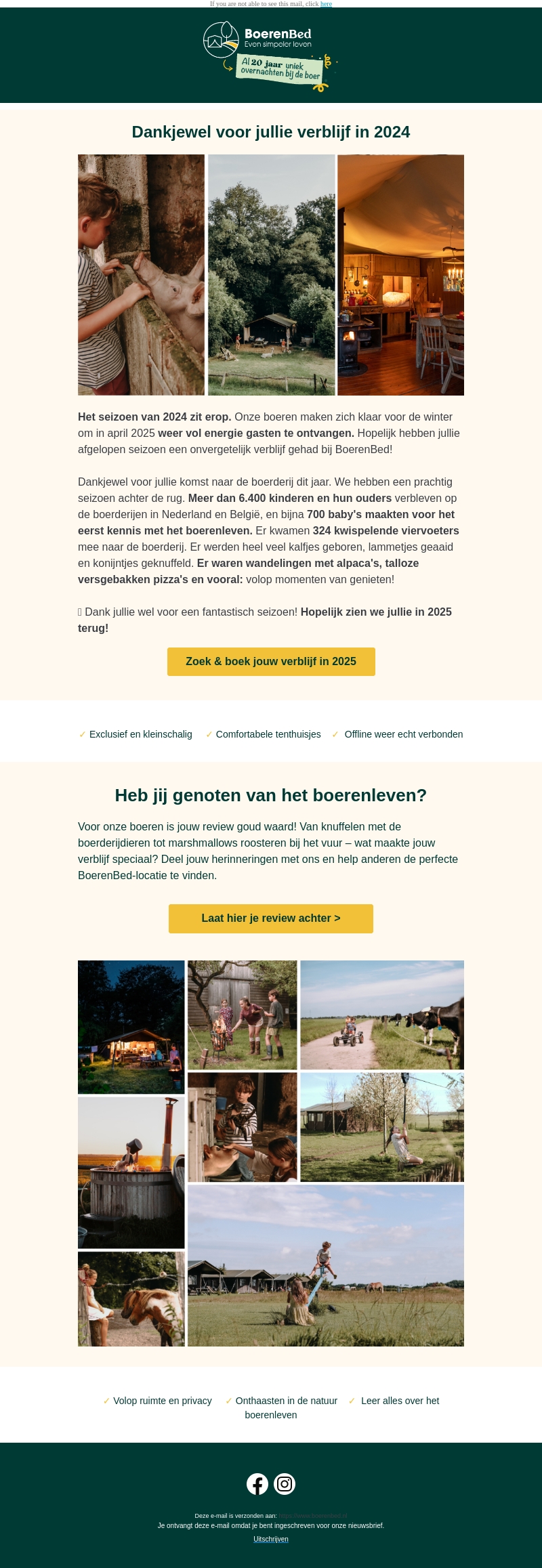 BoerenBed kijkt terug op een prachtig seizoen 2024. Het avontuur op de boerderij was een succes met vele gasten die genoten van een uniek verblijf, compleet met boerderijactiviteiten. Boek nu je verblijf voor 2025 en maak opnieuw kennis met het ongedwongen boerenleven.