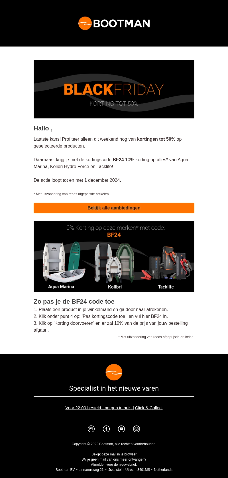 Mis deze kans niet! Alleen dit weekend krijg je tot 50% korting op geselecteerde producten bij Bootman. Gebruik de kortingscode BF24 voor extra 10% korting op merken als Aqua Marina, Kolibri Hydro Force en Tacklife. De actie loopt tot en met 1 december 2024. Wees er snel bij, want op=op!