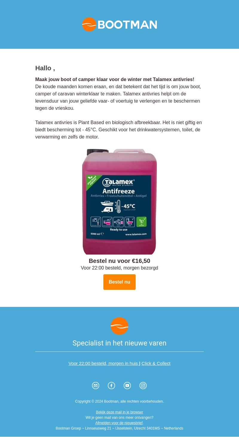 De winter staat voor de deur! Zorg dat je boot, camper of caravan goed beschermd is met Talamex antivries. Het product is biologisch afbreekbaar, niet giftig en biedt bescherming tot -45°C. Geschikt voor drinkwatersystemen, toilet, verwarming en zelfs de motor. Bestel nu en verleng de levensduur van jouw voertuigen.