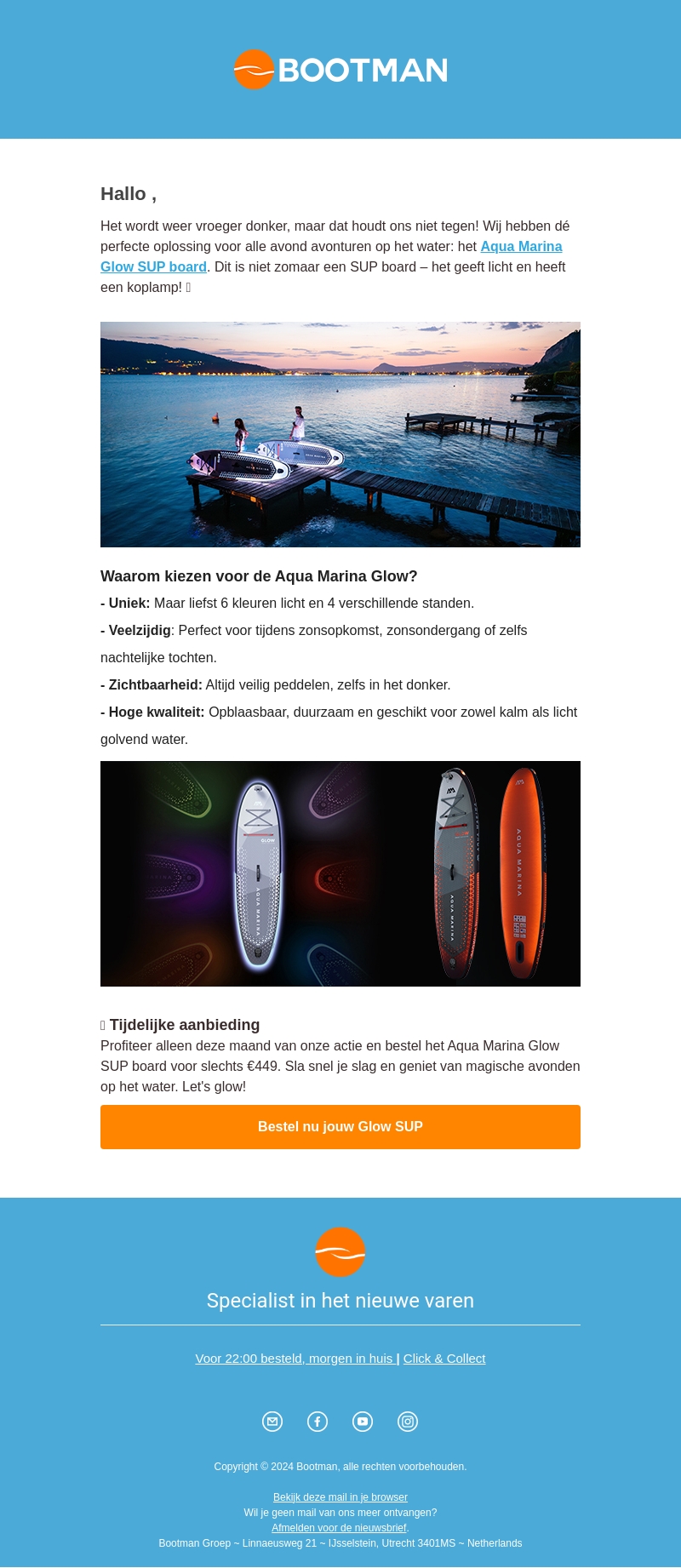 Het wordt steeds vroeger donker, maar dat is geen reden om niet het water op te gaan. Met het Aqua Marina Glow SUP-board geniet je van 's avonds suppen dankzij de unieke verlichte functies. Dit opblaasbare board is niet alleen duurzaam, maar biedt ook extra veiligheid en veelzijdigheid.