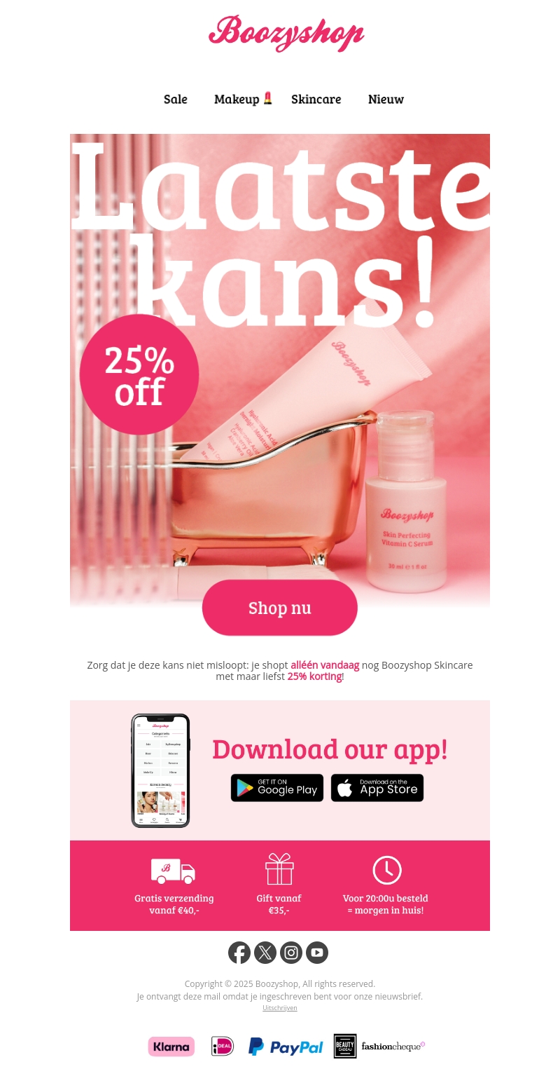 Grijp je kans met Boozyshop's laatste kortingsactie. Alleen vandaag ontvang je 25% korting op geselecteerde skincare producten. Bezoek onze winkel en ontdek geweldige aanbiedingen. Zorg dat je de korting niet mist. Shop snel en profiteer van deze beperkte tijdsdeal.