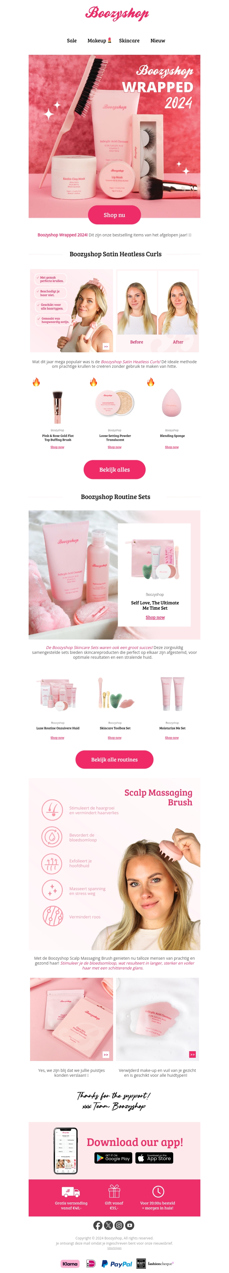Boozyshop Wrapped 2024 presenteert de nieuwste schoonheidsproducten en onmisbare items voor het komende jaar. Ontdek de populaire Boozyshop Satin Heatless Curls voor prachtige krullen zonder hitte. Ervaar de luxe Routine Sets voor een stralende huid. Vergeet niet de Scalp Massaging Brush voor gezond haar en ontspanning. Shop nu voor de beste deals!