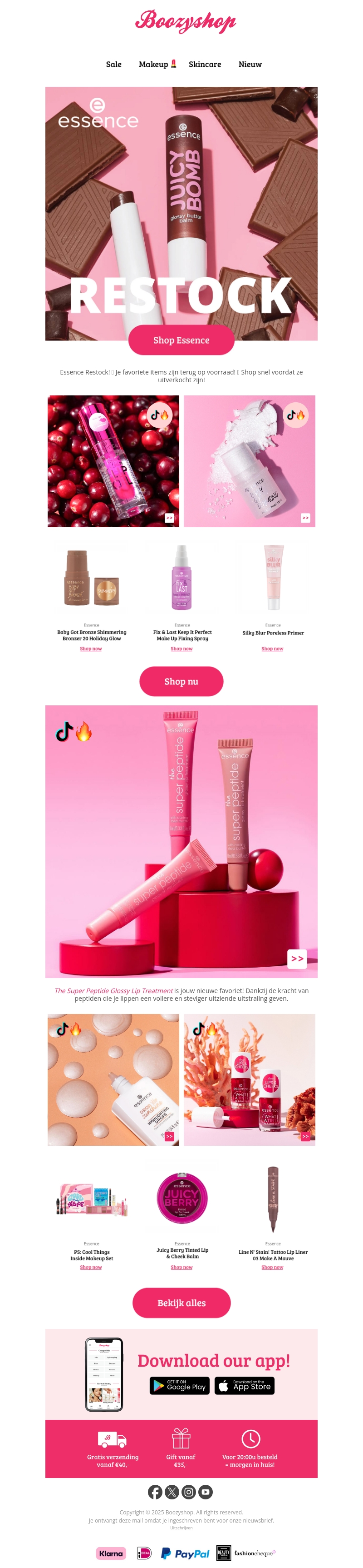 Essence restock is er! Jouw favoriete producten zijn nu weer beschikbaar. Ontdek de nieuwste make-upproducten zoals de Juicy Bomb Gloss bij Boozyshop. Van glanzende lipbalsems tot krachtige peptidebehandelingen, alles staat klaar om jouw look te vernieuwen. Mis deze geweldige kans niet en scoor jouw favorieten voor ze uitverkocht zijn.