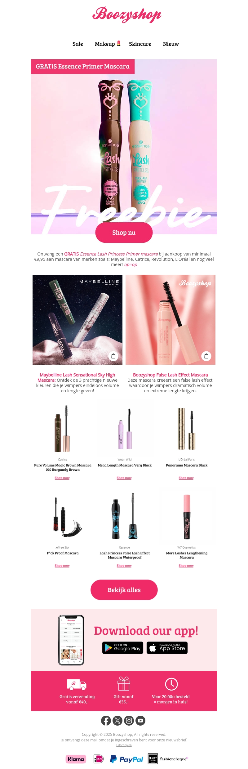 Boozyshop biedt een speciale actie aan waarbij je een gratis Essence Lash Princess Primer mascara krijgt. Deze aanbieding is geldig bij een aankoop van minimaal €9,95 aan mascara van merken zoals Maybelline, Catrice, en L'Oréal. Zorg ervoor dat je snel bent, want op=op. Ontdek een wereld aan prachtige mascara-opties en geniet van eindeloos volume en lengte.