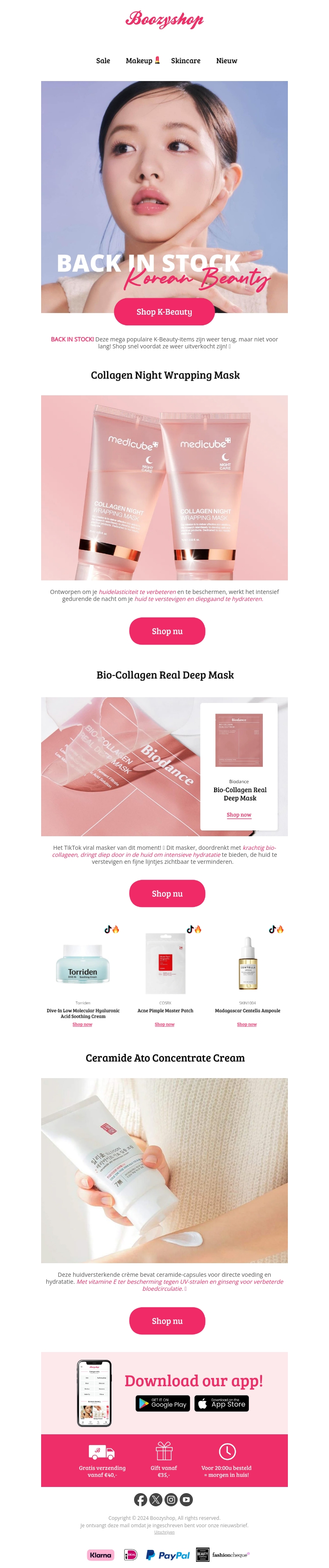 De K-Beauty collectie is weer helemaal terug op voorraad bij Boozyshop! Verwen je huid met de befaamde Collagen Night Wrapping Mask en de Bio-Collagen Real Deep Mask. Ideaal om je huid te hydrateren en revitaliseren. Bestel nu en geniet van gratis verzending bij aankopen vanaf €40!