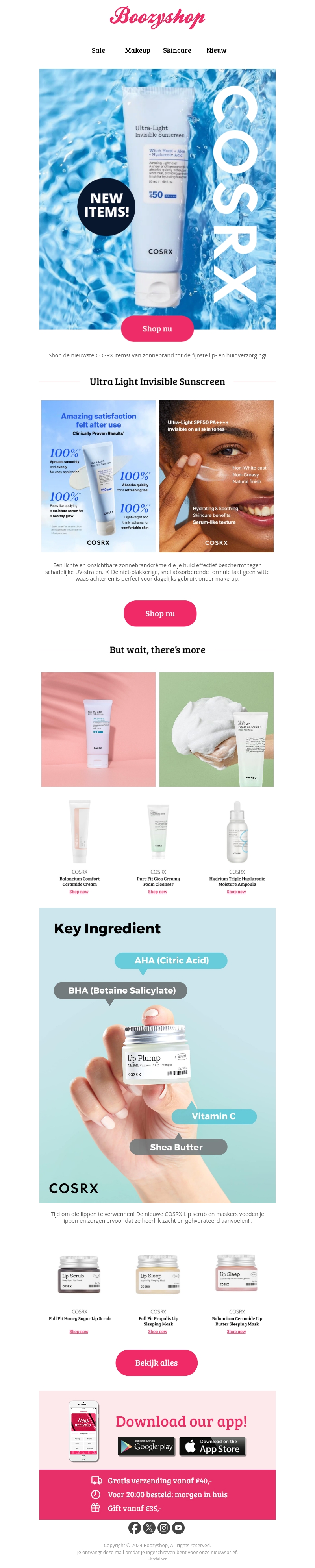 Ontdek nu de nieuwste items van COSRX bij Boozyshop! Van de onzichtbare zonnebrandcrème tot verzorgende lipproducten, COSRX heeft alles om je huid te beschermen en te hydrateren. Mis de Ultra Light Invisible Sunscreen niet, die 100% veilig is voor alle huidtypes. Bekijk ook de andere topverzorgingsproducten van COSRX voor de ultieme huidverzorging.