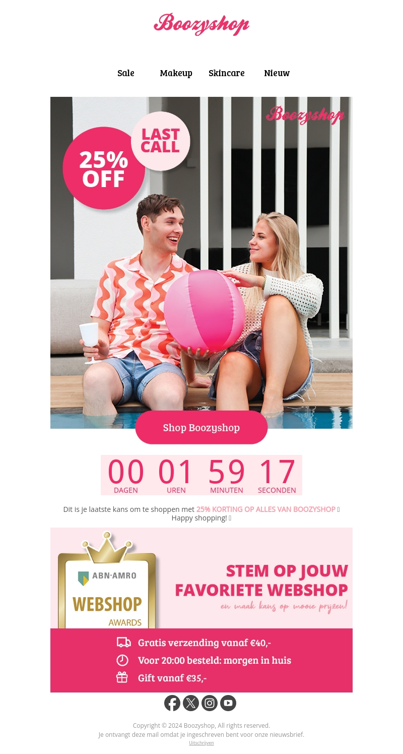 Mis deze kans niet! Boozyshop biedt nu 25% korting op alles in de winkel. De klok tikt, dus zorg dat je op tijd bent om van deze geweldige aanbieding te profiteren. Gratis verzending vanaf €40 en snelle levering gegarandeerd. Stem ook op jouw favoriete webshop en maak kans op mooie prijzen.